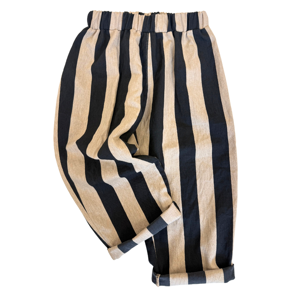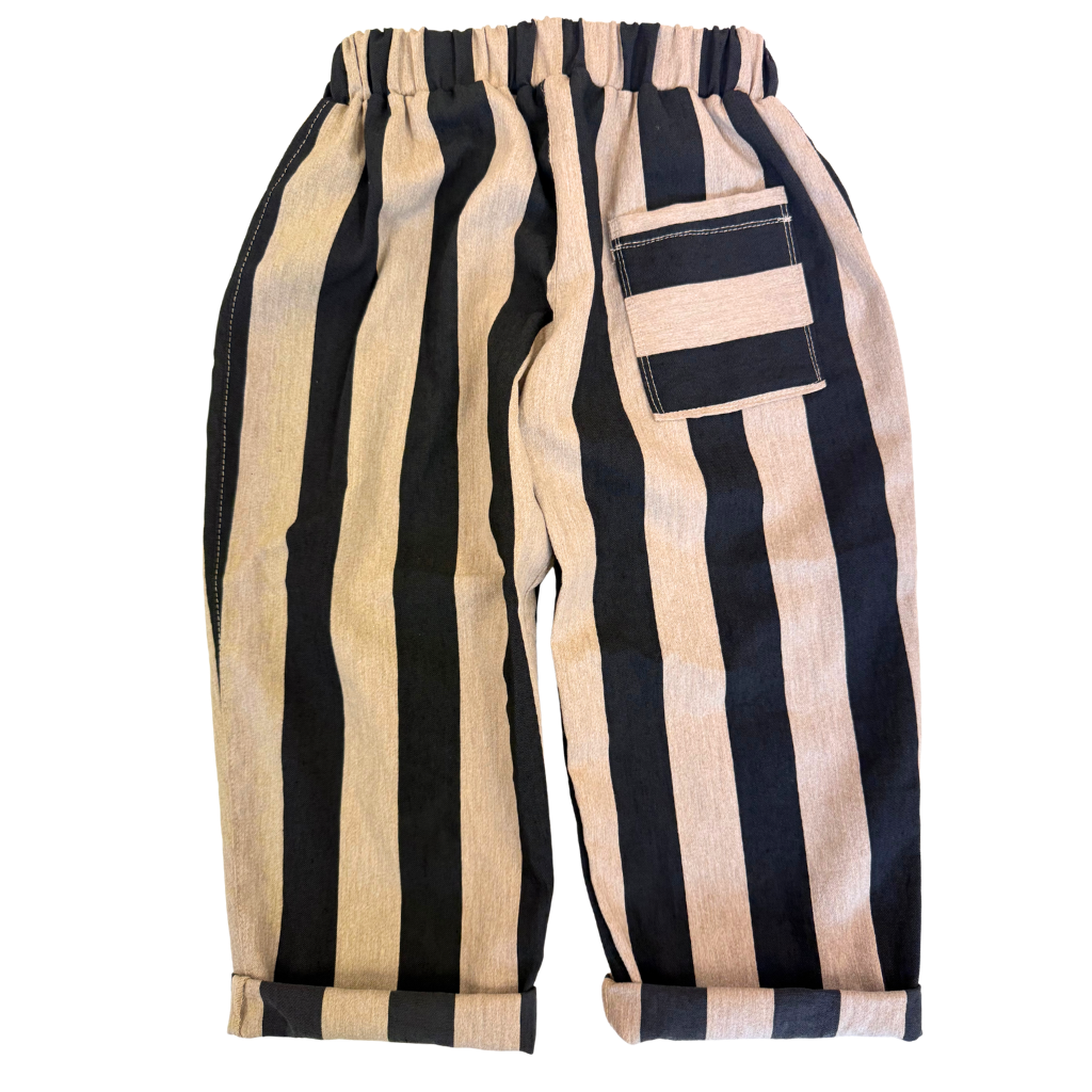 Dětské stylové plátěné kalhoty střihu BARREL. Rozšířené v oblasti zadečku a stehen, zúžené u kotníků. Nohavice odspodu pohodlně zahrnete na potřebnou délku. Vydrží tak přes více velikostí.