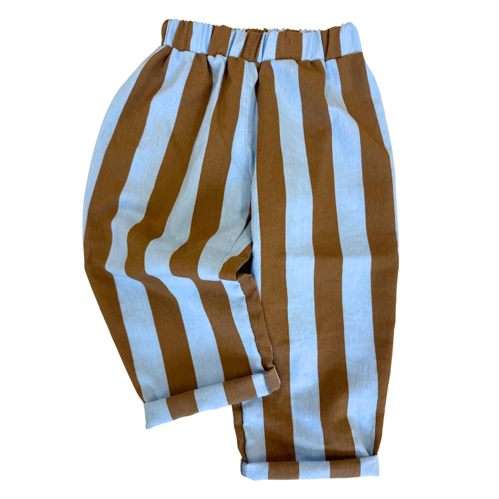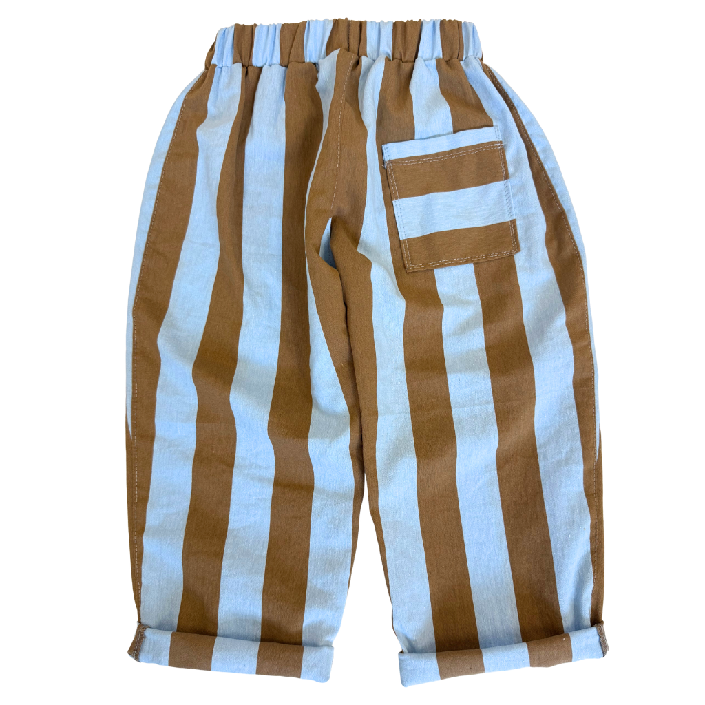 Dětské stylové plátěné kalhoty střihu BARREL. Rozšířené v oblasti zadečku a stehen, zúžené u kotníků. Nohavice odspodu pohodlně zahrnete na potřebnou délku. Vydrží tak přes více velikostí.