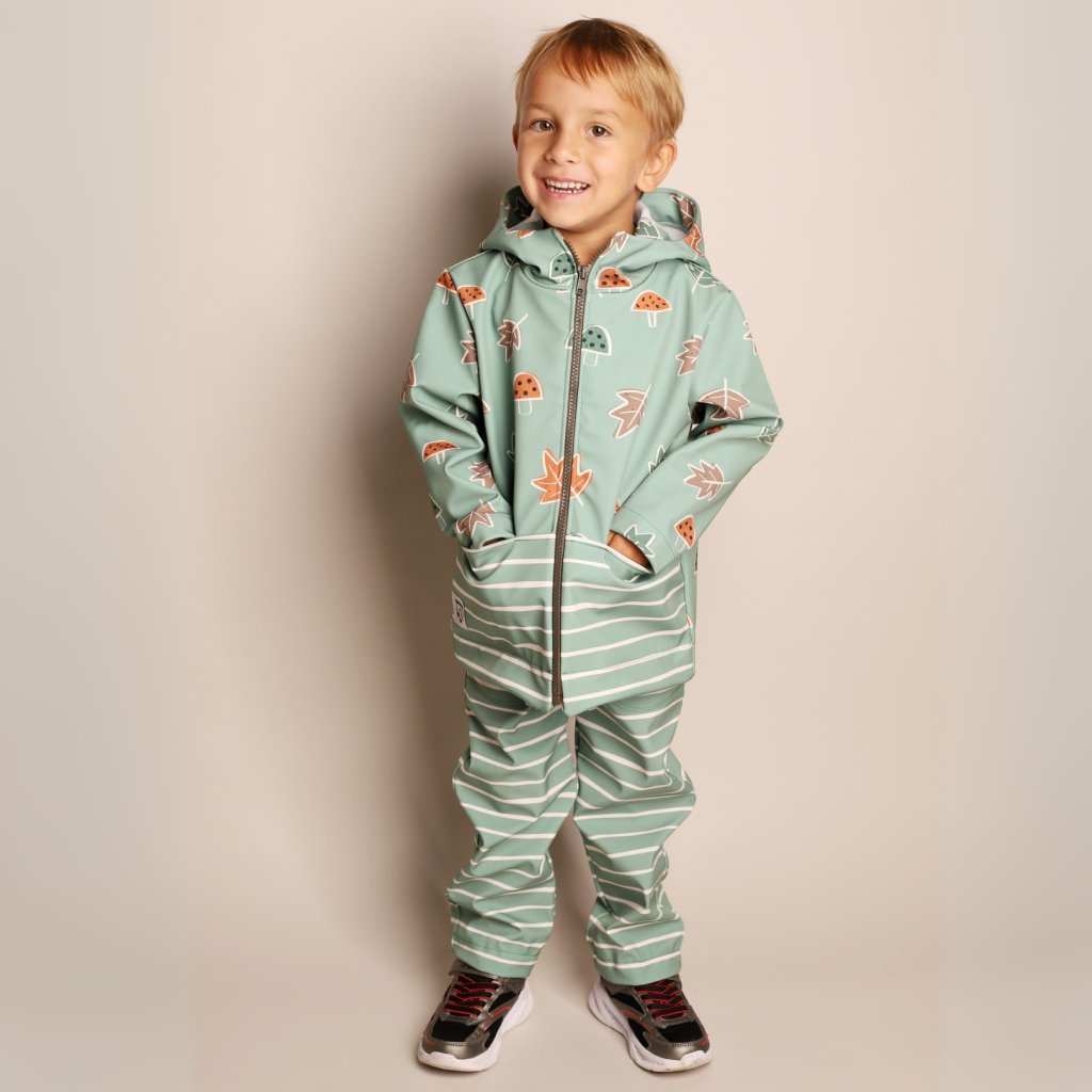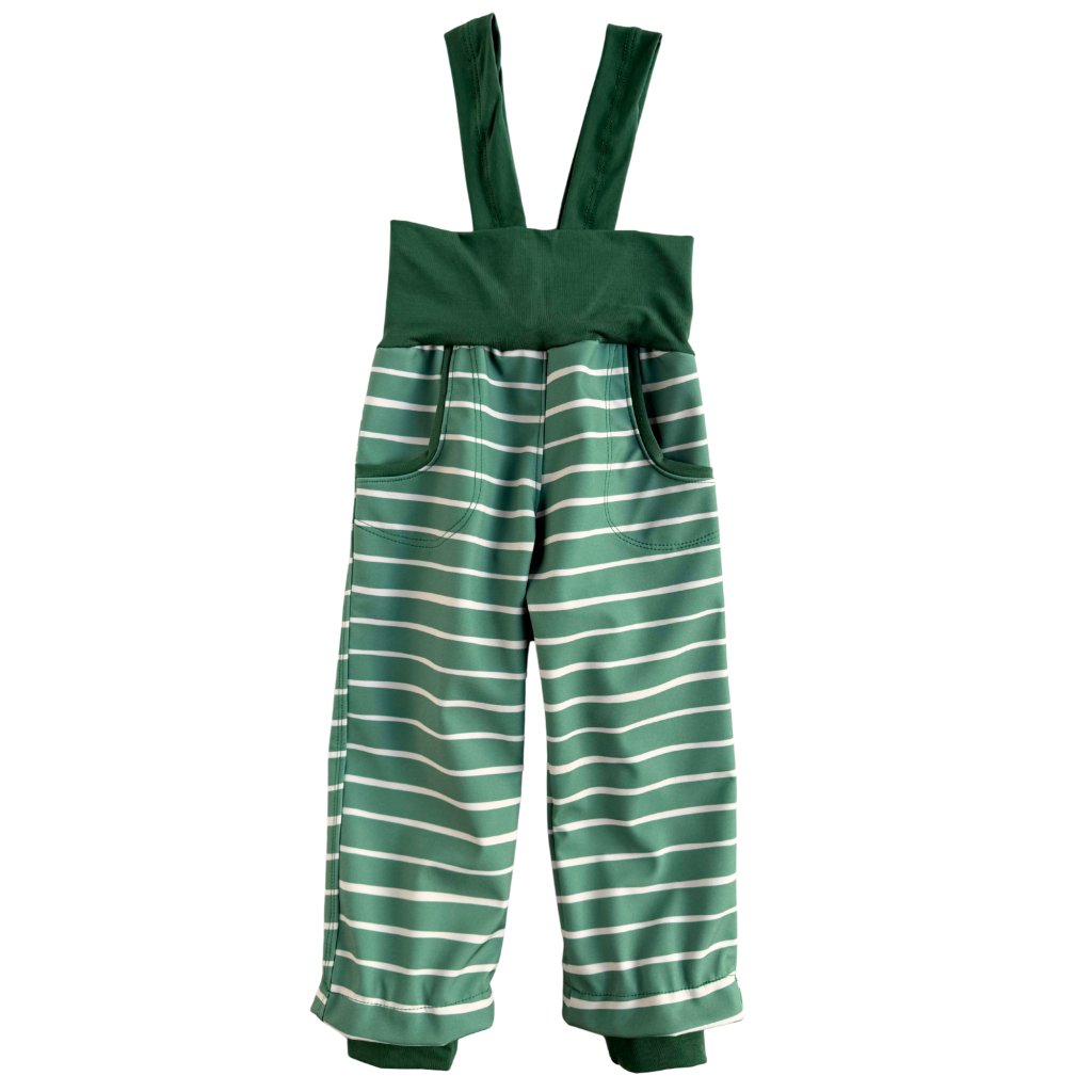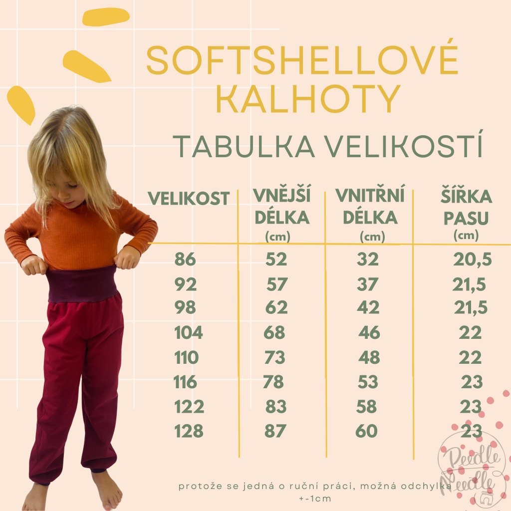 Použitý softshell je funkční prodyšná a nepromokavá látka. Udrží dítko v suchu, teple a zároveň se však nezapotí. Na údržbu je to parťák. Menší nečistoty stačí otřít vlhčákem, po koupeli v blátivé kaluži stačí kalhoty prohnat pračkou na jemný režim 30 °C bez aviváže! a jsou zase jako nové :-).