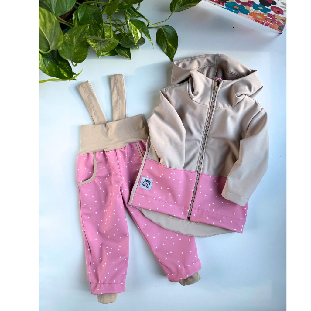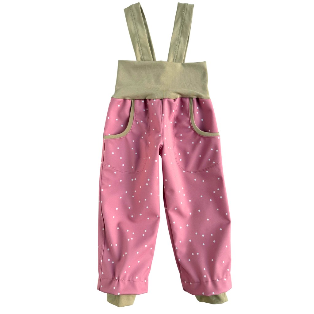 Použitý softshell je funkční prodyšná a nepromokavá látka. Udrží dítko v suchu, teple a zároveň se však nezapotí. Na údržbu je to parťák. Menší nečistoty stačí otřít vlhčákem, po koupeli v blátivé kaluži stačí kalhoty prohnat pračkou na jemný režim 30 °C bez aviváže! a jsou zase jako nové :-).