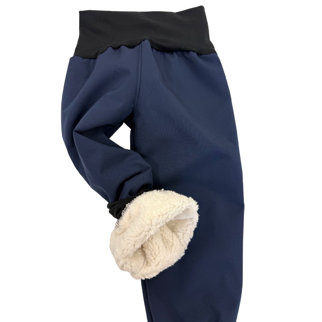 Dětské softshellové kalhoty s beránkem v modré barvě. Využijete při chladnějším podzimu a celou zimu. Jsou nepromokavé, takže si v nich Vaše děti užijí i bezva koulovačku.