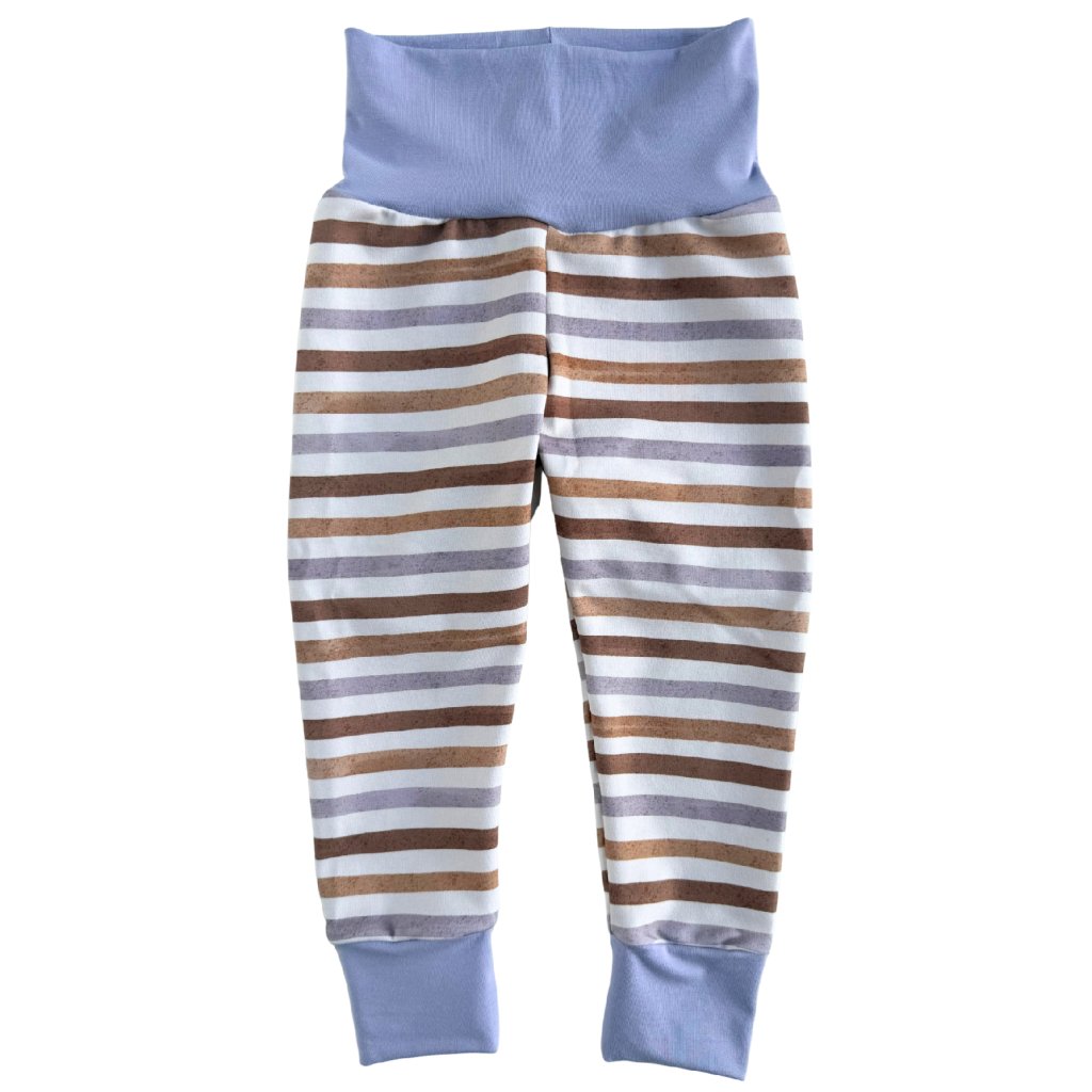 Vysoký pas a lem nohavic z úpletu můžete zahrnout na aktuální potřebnou velikost a tepláčky tak porostou chvilku s děťátkem.